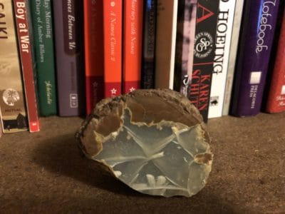 My guess is someone picked it up, cut it open, started to polish it and realized, it’s really nothing special. I’ve Googled thunder eggs (or thundereggs) and seen some with beautiful insides. Mine is not beautiful. It’s really rather dumpy. So, whoever found it must have tossed it away, not realizing that this “ugly” rock would be prized by some 10-year-old girl who would view it as the star of her collection. Nor could they have guessed that 40 years later, it would still sit on the bookshelf next to my desk.